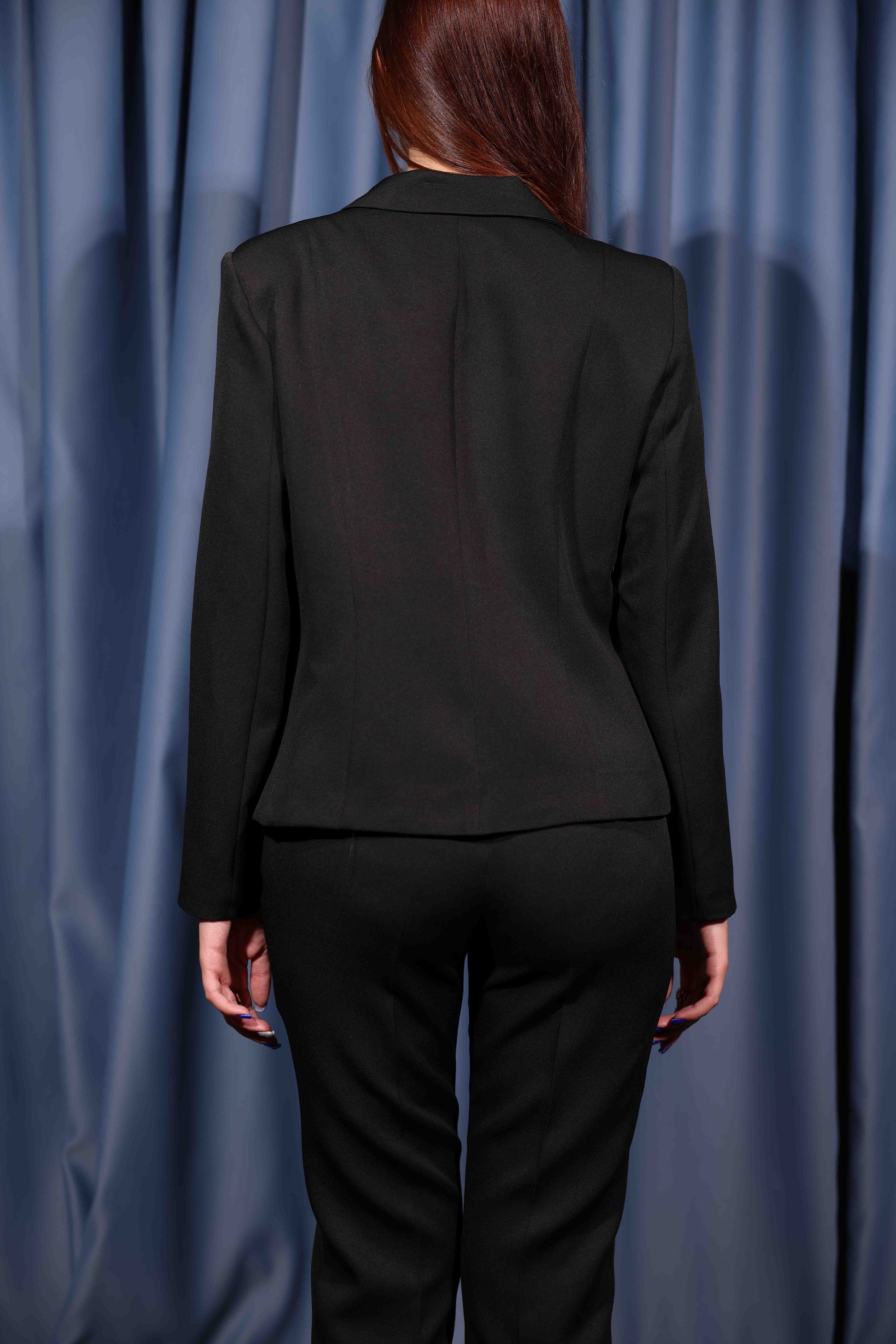 A chic black blazer and pants set, elevated with eye-catching silver capson details on the blazer. The sleek tailoring and modern accents make this outfit perfect for both formal occasions and stylish evening wear.
