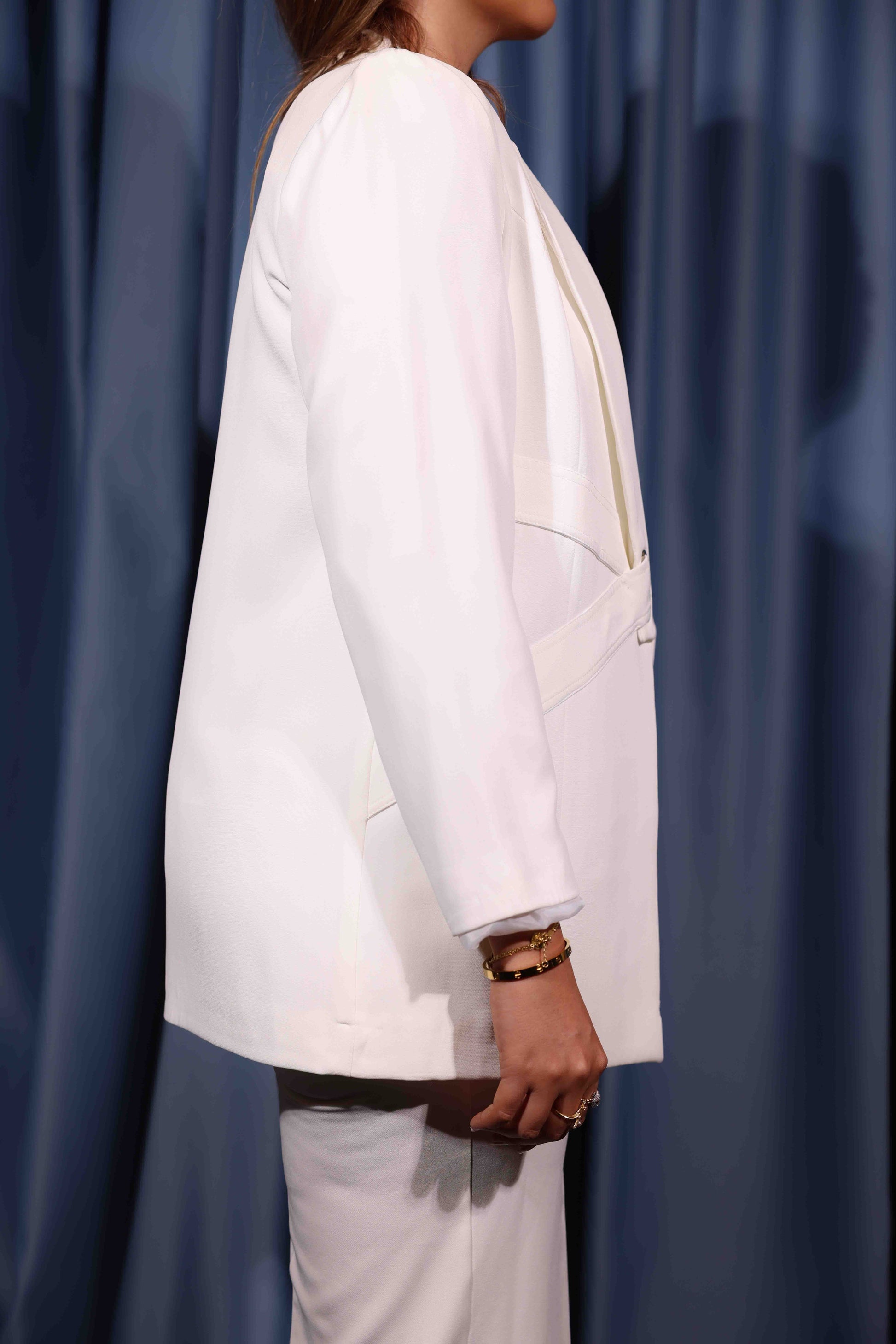 A full white blazer featuring a unique belt detail fixed to the design, adding a modern twist to its classic silhouette. Elegant yet contemporary, it’s a standout choice for polished and special occasions.